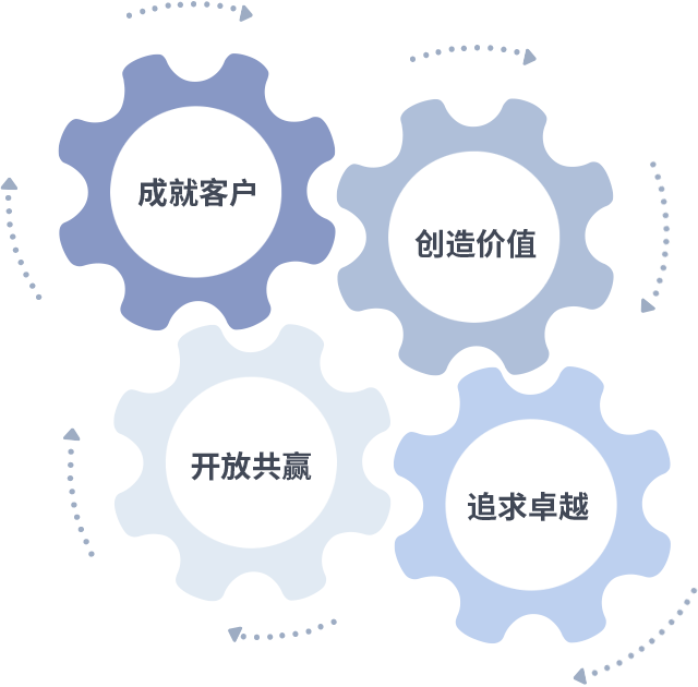 成就客户是一切决策的出发点,,,创造价值是衡量所有工作的标准,,,,追求卓越是我们做事做人的态度,,,开放共赢是我们的格局也是最终的结果。。。价值观的齿轮环环相扣,,,,推动着组织里的每个人不断向前。。。